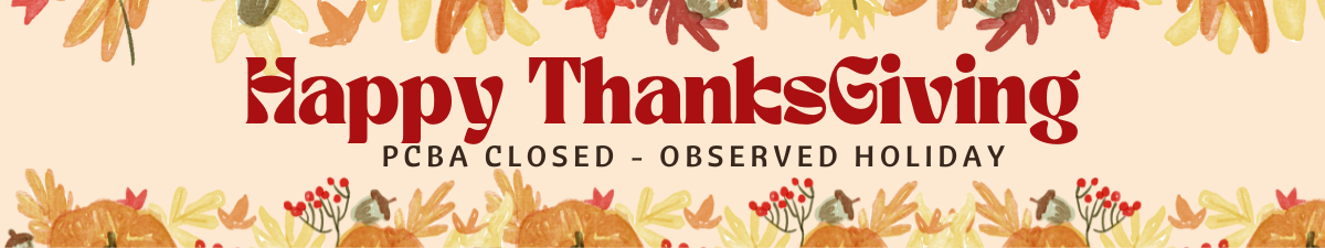 Thanksgiving: PCBA Closed Happy Thanksgiving! -PCBA Staff Thanksgiving: PCBA Closed Set a Reminder Enter your email address below to receive a reminder message. Email address Select the amount of Days before the event -- Select Days Before Event -- 1 Day 2 Days 3 Days 1 Week Captcha Validation Please complete the Captcha Submit Date and Time Thursday Nov 27, 2025 Friday Nov 28, 2025 Closed Thursday & Friday Set a Reminder Enter your email address below to receive a reminder message. Email address Select the amount of Days before the event -- Select Days Before Event -- 1 Day 2 Days 3 Days 1 Week Captcha Validation Please complete the Captcha Submit Share × Print Email Add to Calendar Facebook Twitter LinkedIn Tell a Friend × Select Calendar Type × Google Yahoo iCal (Outlook, Apple, or other)